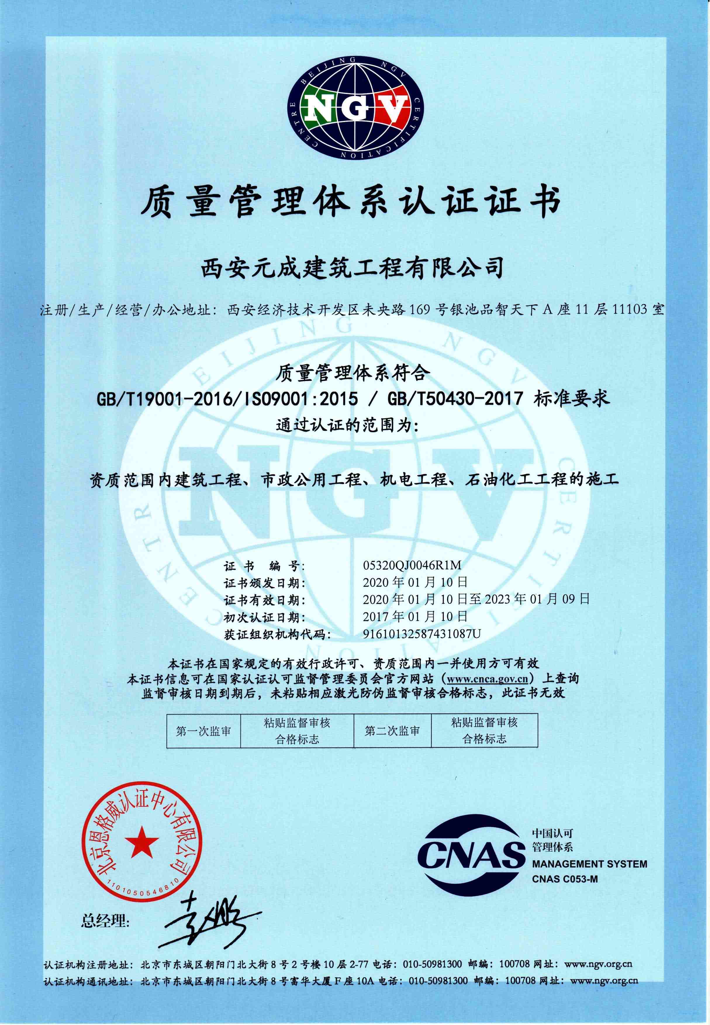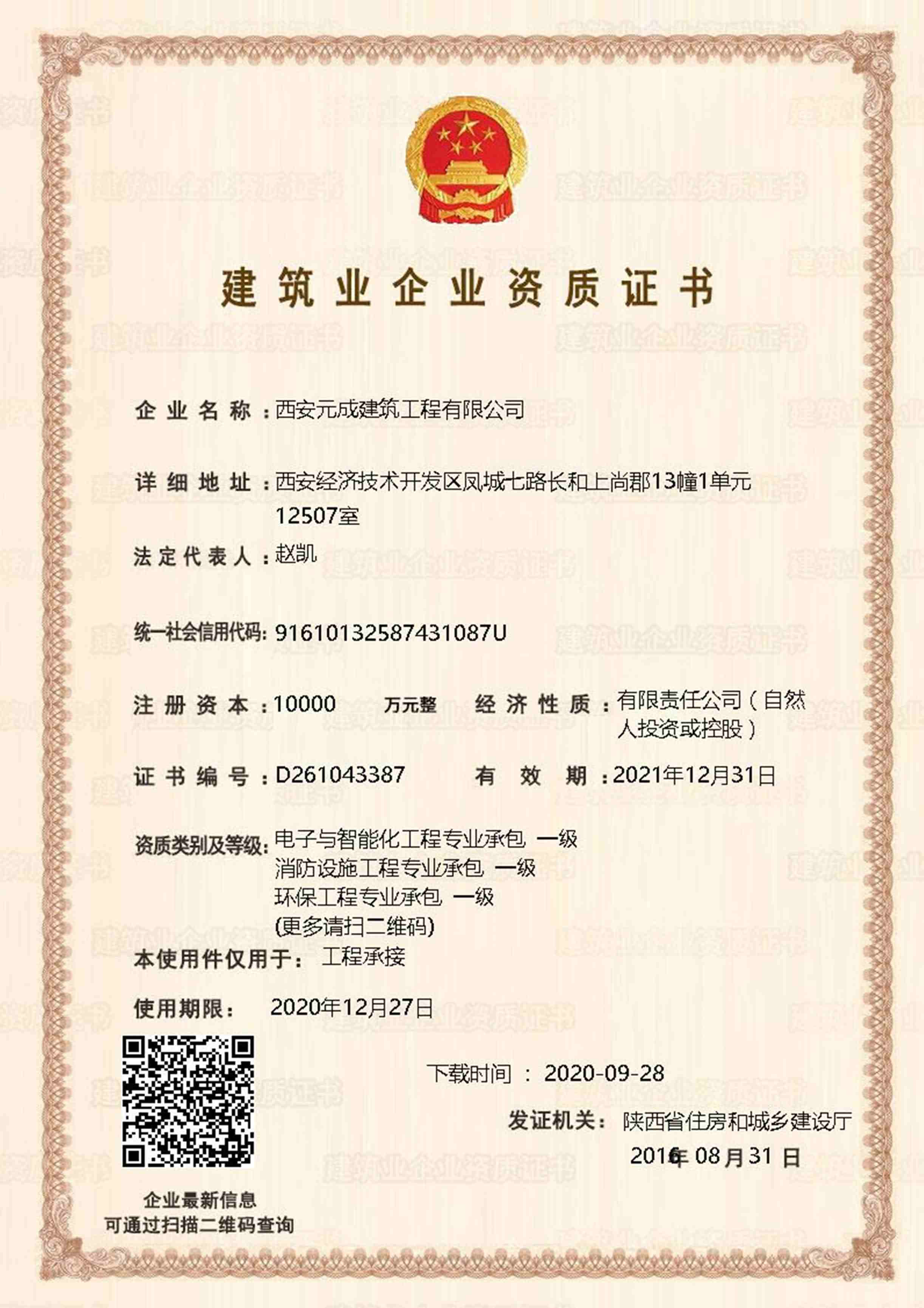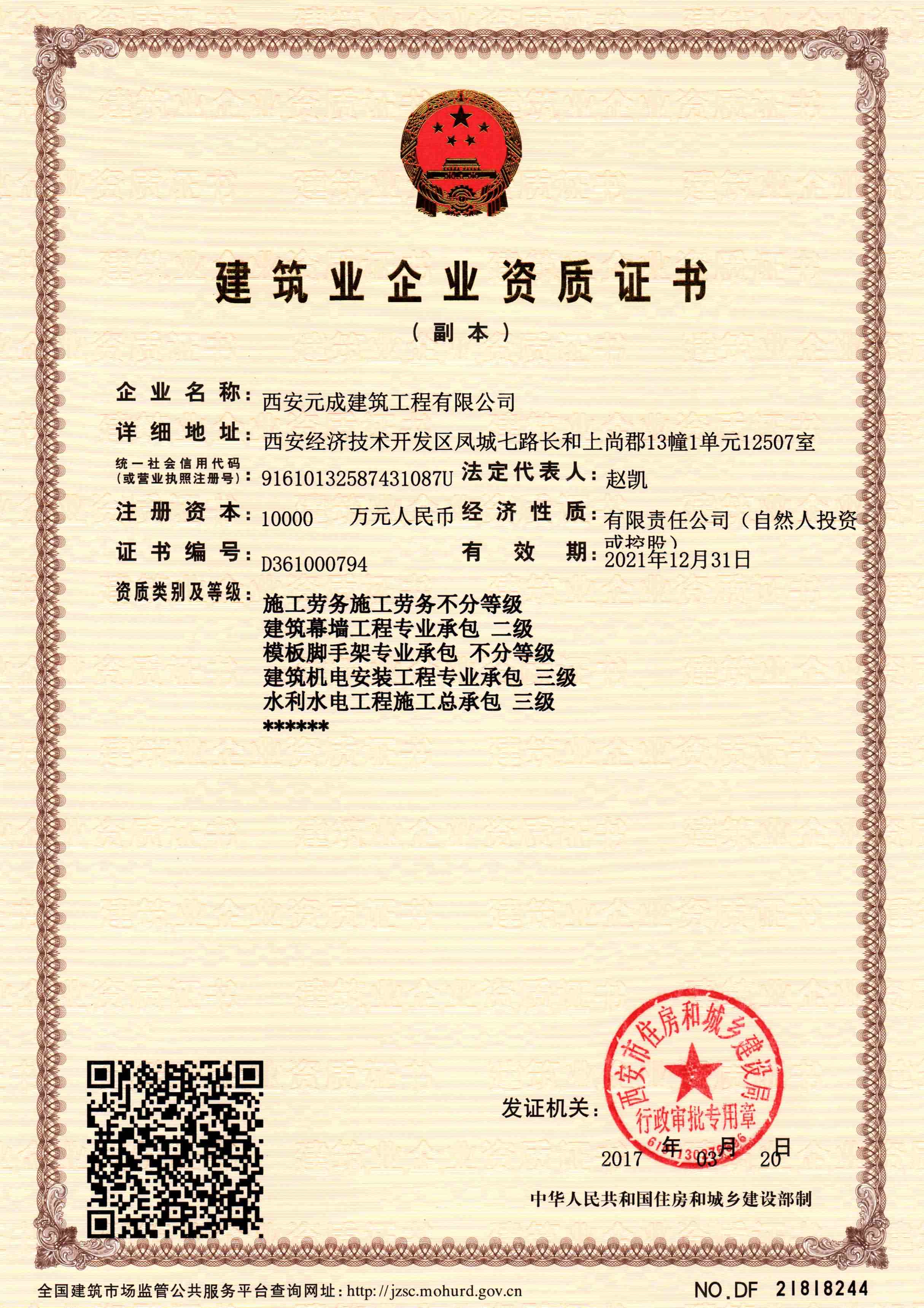 西安元成建筑工程有限公司成立于2012年,是一家擁有建筑工程、市政公用工程、石油化工工程、機電工程施工總承包貳級;鋼結構工程、防水防腐保溫工程專業(yè)承包貳級;電力工程、水利水電工程施工總承包叁級;建筑機電安裝工程、輸變電工程、環(huán)保工程專業(yè)承包三級;模板腳手架專業(yè)承包、勞務分包等綜合性施工企業(yè)。